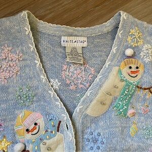 Adorable white stag holiday vest with snowman, beading and sequin embellishment. Excellent condition. Size XL see measurements for details.