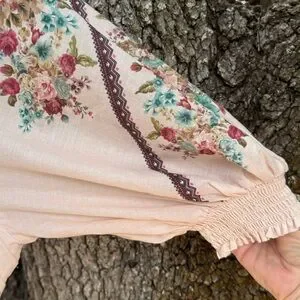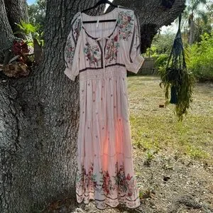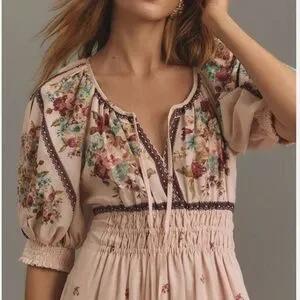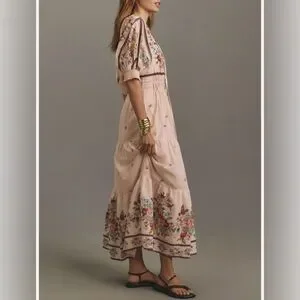 Anthropologie-Romantic cottagecore pink floral Somerset maxi dress with elastic smocked waist Feminine puffed sleeves and tiered skirt.Has 2 pockets and is lined.Size L and is 55” in length.Feminine . Romantic . Vacation . Floral . Cottagecore . Coastal Cowgirl . Prairie . Garden Girl . Boho . Bohemian . Valentine’s Day . Euro Summer . Spring . Festival . Date Night . Party . English Garden . Hippie . Earthy .