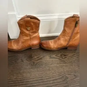 Stylish and durable brown leather boots. Only worn few times. The color and aging material of leather on boot is the style and how they are intended to look!