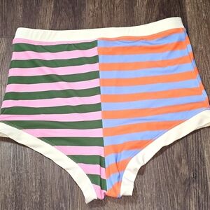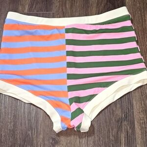 The Lime Ricki ×Lars Umbrella Stripe Retro Boy Shorts in size XL are perfect for a day at the beach, by the pool, or on vacation. Made from a comfortable blend of nylon and spandex, these multicolor striped shorts feature a retro design and are lined for added comfort. With UV protection properties, these bottoms are ideal for enjoying fun in the sun while looking stylish and chic. Perfect for women who want a unique swimwear option that combines fashion and functionality.