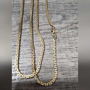 A vintage Monet chain necklace in a polished gold tone finish. This Monet box chain is 37 inches long and 3/16 inch wide. Can be worn doubled over or more. This Monet gold necklace is signed MONET© on the metal hang tag as well as early version of a lobster claw clasp. This 70s Monet necklace that is in excellent vintage condition without any flaws or wear to note. A Monet necklace that would be a beautiful addition to your vintage Monet jewelry collection.