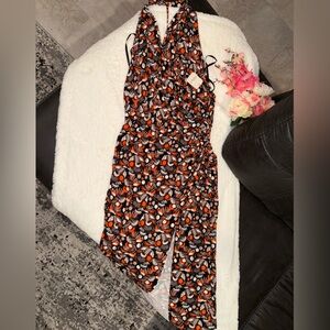 Bold maxi dress with striking orange and black pattern. Sleeveless design for versatile wear.