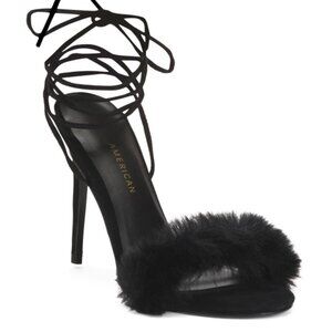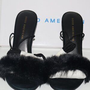 Good American Fluff Wrap Heeled Sandals Black Faux Fur Stiletto 4in Size 7