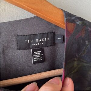 Ted Baker Floral Mekayla Midi Dress. Size 1 or a US size 4. Features a black multicolor organza design with elbow-length puff sleeves. In excellent like new condition, only worn once. Retailed for $445.