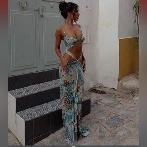 Stunning maxi dress with a vibrant floral pattern. Features a unique cut-out design.