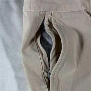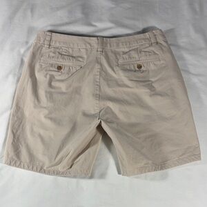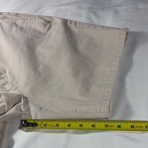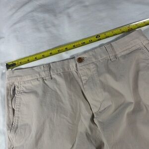 Great condition, soft, comfortable, 92% cotton 8% spandex, stone khaki color, flat front, zipper fly, button closure, extra buttons included (pictured), 7” inseam 34" waist (actual measurements pictured)