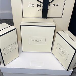 3 For 1 Deal on Sophisticated Jo Malone set. Cream boxes with elegant black trim. Tissue Paper Included and Shopping Bag!