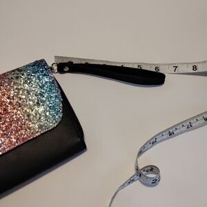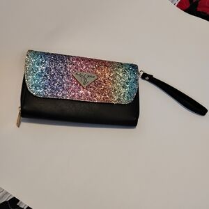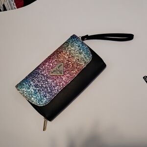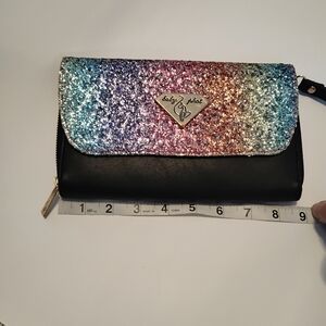 Add sparkle to your outfit with the Baby Phat Multicolor Glitter Clutch. This stylish bag features a vibrant glitter design and a sleek black base, perfect for any occasion.