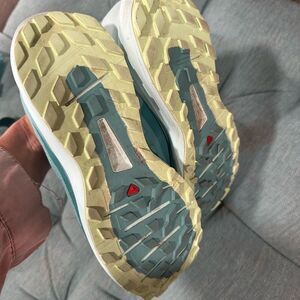 @mirionk Hi! They are a blue green (teal color). I looked them up and the are water resistant and designed for drainage but not fully waterproof like the sense ride 8 GTX model. Salomon however is known for its amazing durability in the element so I’d say it’s a pretty good choice overall (unless you’re walking through rivers or streams / rain all day) :)