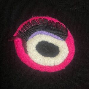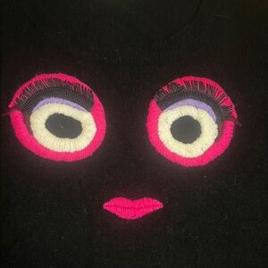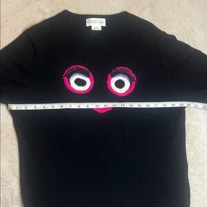 Playful black sweater from Kate Spade's Broome Street collection. Perfect for stylish layering. Embroidered face on front. Original crystal style bead in centre of eyes removed.