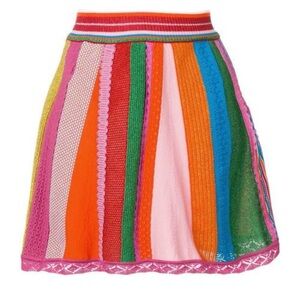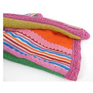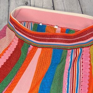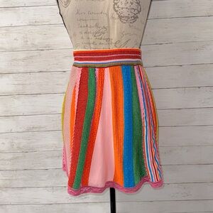 Moschino Couture size 4 mini skirt composed of multicolor panels of crochet, knit, embroidered, & ribbon of all different shimmer/metallic fabrics. Pull-on high rise with rib knit elastic waistband. Pink crochet lace trim. Unlined.