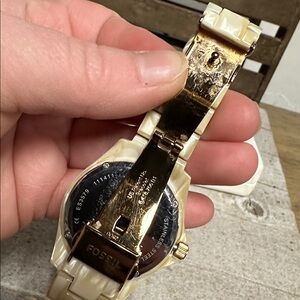 Authentic with some superficial wear to the hardware as shown and no visible scratches on the face glass 7/10! *Brand new battery* Fossil great shape Riley multi function crystallized shimmering horn resin pearlized cream link rose gold stainless steel crystal circle fold over clasp analog calendar date scratch resistant mineral crystal water resistant 165 ft quartz battery 5ATM ES3579 111411 women’s watch with gift box. 1.5” clock face. 7” around.