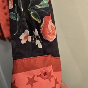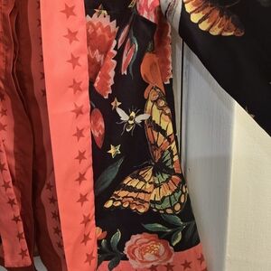 Vibrant blouse with floral and butterfly print. Red and black color scheme. Button-up front with collar. Perfect for a bold look.