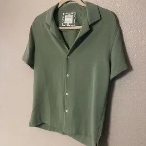 Stylish olive shirt with short sleeves. Ideal for casual outings. Comfortable and versatile.