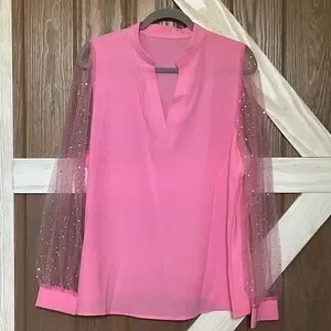 This elegant pink or blue blouse features stylish sheer sleeves, perfect for adding a touch of sophistication to any outfit.