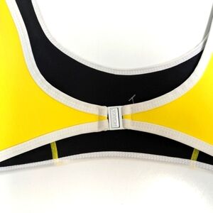 Lemon yellow neoprene bikini set in yellow with white piping. Metal clasp back closure and modern bottom.