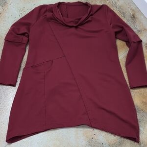 Stylish handmade dark red tunic dress with long sleeves. Features a unique draped neckline and side pocket. Super comfy and stretchy material.