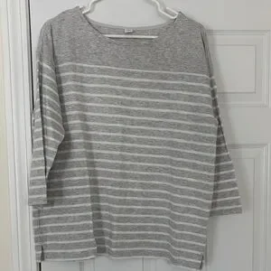 Chic and comfortable long sleeve top. Features classic gray and white stripes. Ideal for casual wear.
