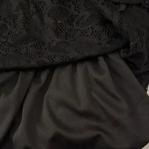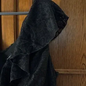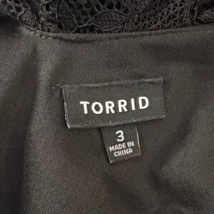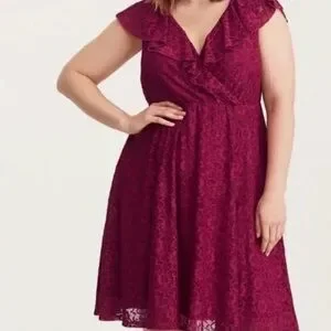 Chic black midi dress by torrid. Features delicate lace and ruffle accents. Ideal for versatile styling.Fully lined. Only could find stock photo in fuchsia.