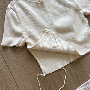 Stylish cream ribbed top with matching wrap skirt. Features a tie detail and ruffled hem.