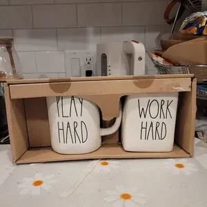 Rae Dunn set with 'Play Hard' mug and 'Work Hard' holder. Perfect for home office.