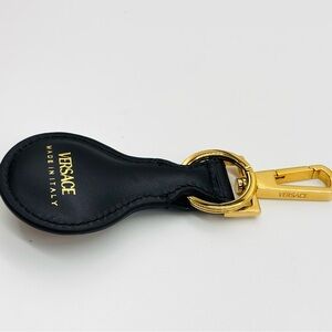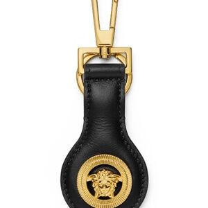 Sophisticated Versace key holder. Black leather with gold Medusa emblem. Perfect for adding luxury to your essentials.