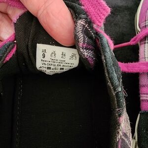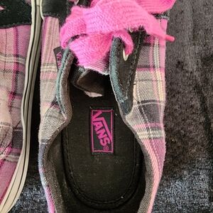 Stylish Vans athletic shoes. Features plaid pattern with vibrant pink laces. Comfortable and trendy.