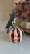 This crow with a body of Courtly Check perches on the edge of Courtly Stripe pumpkin. This piece really shines when the battery-operated LED light in the pumpkin switches on.