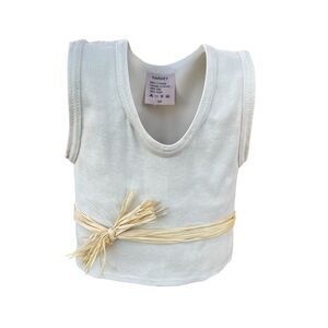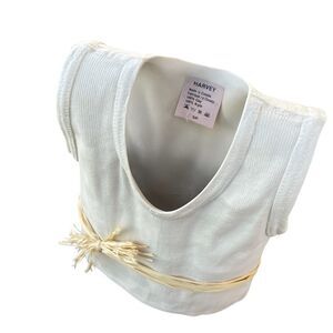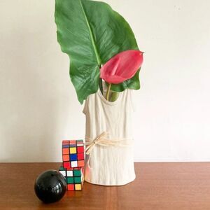 A vintage 1980s pop art bisque t-shirt/tank top vase made by Canadian artist Michael Harvey. Excellent condition with no chips or cracks. Harvey's work shows mundane everyday objects (a paper bag, a glove, a t-shirt) cast in ceramic. Cleverly, this t-shirt vase has a fabric label on the inside where the shirt's label would be.