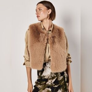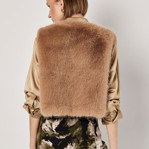 Super soft, semi cropped fur vest in tan faux fur. Has hook and eye closures.
