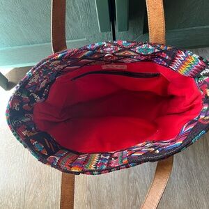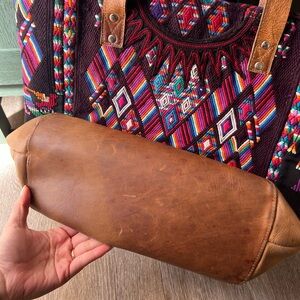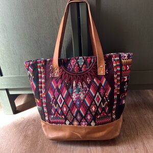 One of a kind, eye-catching tote with geometric patterns. Handmade in Guatemala. Features vibrant colors and tan leather base. Ideal for everyday use.