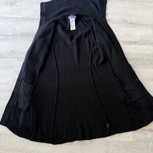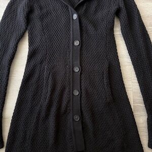 Adorable Black Textured Cardigan Sweater Merino Wool Soft Cozy Perfect fir All seasons and layering long cuffed sleeves Button closure has shape to it two side pockets lined knit medium weight Size XS 15” across chest 32” length from back top of collar to bottom hem 27” arms winter cozy travel casual Wool Knit no flaws perfect condition!