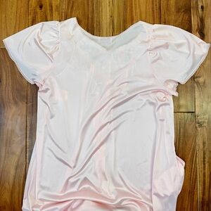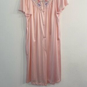 Vanity Fair Vintage Women’s Silk Nightgown Pink With Lace Trim Size Large. Front button closure, embroidered lace neckline, one side pocket, silk material. Used, in good condition. Only flaw is a tiny little pin sized hole on the back. Please see pictures where I point out flaw in red.