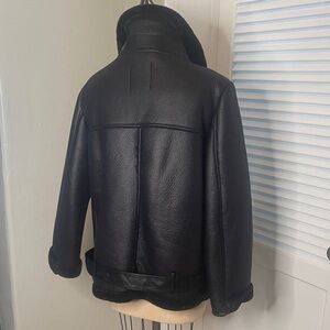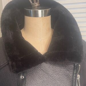 Stay warm and stylish with this black faux shearling women's jacket. Perfect for any occasion, this jacket offers both comfort and style.