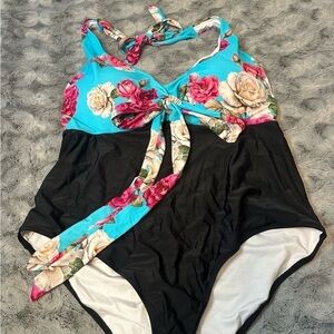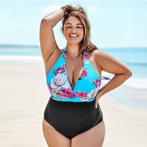 New NWT Cupshe Pink Blue Floral and Black Halter One Piece Swimsuit Women's 3X