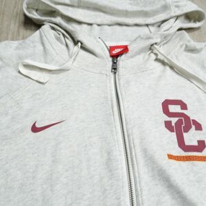 Comfortable gray hoodie with zip-up front. Features maroon Nike logo and SC design. Adjustable hood with drawstrings.