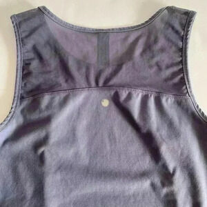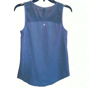 Yogalicious Top. Tank top style with mess sleeve and back. Princess seam in front runs from neck to hem. U shape hem at bottom. 88% Polyester 12% Spandex. Color: blue grey. Size XS. Measurements laying flat: Armpit to Armpit 16.5”. Shoulder to hem 23”. Waist 16.5”. Hem 17.5”. No rips, stains, tears or pills. Pet free smoke free environment.