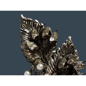 Miriam Haskell Leaf Spray Baroque Pearl Clear Rhinestone Brooch 3" x 2 1/4"