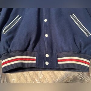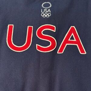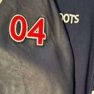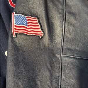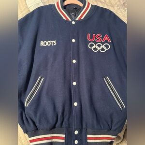 Limited edition collectors item- Roots 2004 Varsity/Bomber Jacket made for the 2004 USA Olympics team. Men’s size XL. Purchased from Roots in Aspen, CO in 2004 for $500. Wool body and 100% leather sleeves. This blue bomber Jacket showcases a striking navy blue body with contrasting leather sleeves. It features a classic white and red striped ribbed collar and prominently displays the text 'USA' along with the Olympic rings logo in red, making it a standout piece for any casual occasion.