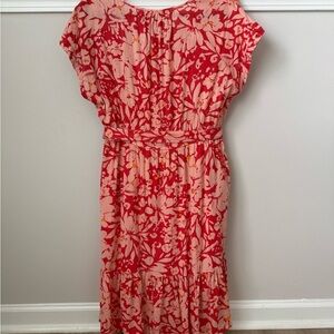 GAP Tiered V-Neck Floral Belted Dress Prairie Cottage Summer Orange Poppy Red M