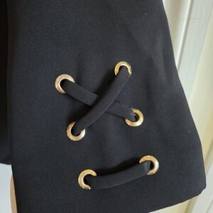 Sophisticated black blazer by Kasper. Features stylish button accents and lace-up sleeve details. Ideal for professional and casual wear.