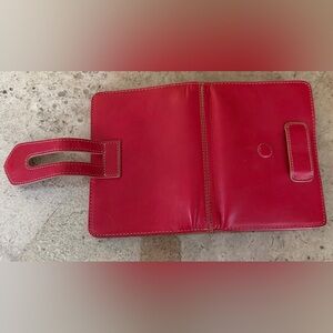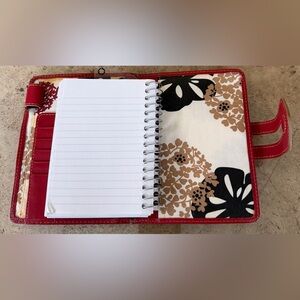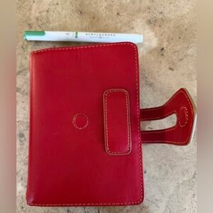 Vintage (2012) Franklin Cover full grain leather notebook cover 38163.450. Buttery soft full grain leather in vibrant cherry red. Excellent condition with a beautiful patina. Lined in fabric patterned in tones of gold, linen, black and mustard yellow. 5 card slot for business or credit cards. Well loved and carefully preserved, original owner. Created in 2012 for the “Her Point of View” weekly wire bound planner. Fits paper size 5.5”H x 4”W. Includes Franklin Covey page marker/ruler. Does not include accessory items in photos.