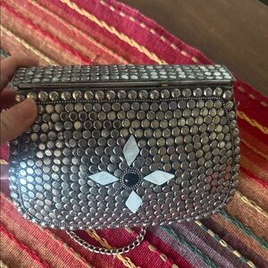 This is a “hard case” shell and iron crossbody bag with a chain that is approx 23 inches. The lining is coming apart but no metal studs or pieces of shell are missing or broken. Super cute and hesitated putting it up I just don’t grab for it at much