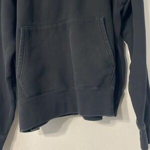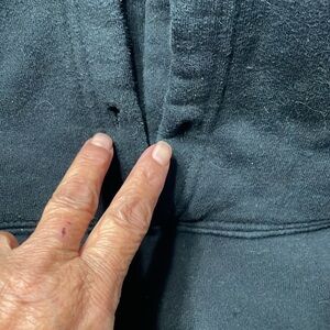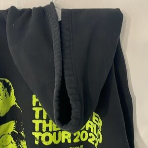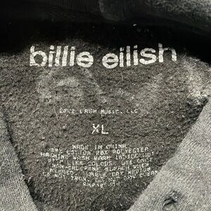 This black sweater features a striking neon green graphic design on the front, showcasing the name 'Billie Eilish' in a unique font. Made with a soft, cotton-like texture, it offers a relaxed fit and a classic crew neck style, perfect for casual wear.Size XL , missing pull string otherwise good condition