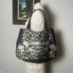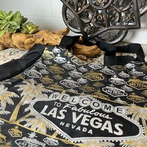Stylish tote bag featuring a Las Vegas theme. Perfect for everyday use with its spacious design. The black and gold colors add a touch of elegance.