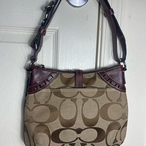 Brand : CoachItem name : Coach Signature Shoulder BagModel number : 10265 - Design -Type : Shoulder BagMaterial : LeatherColor : BeigeGender : Female- Size -Size : Length : 26Depth : 5Height : 21Shoulder strap : 95Item Material : Leather, Canvas, Suede, Enamel, PythonItem Series : SignatureItem Color : Beige x RedInterior : Pocket x 2, Zipper pocket x 1Exterior : Open pocket x 1- Inventory -Serial Number: -*Before purchasing, please refer to the images of the accessories included with the item.- Condition -Condition : Good ConditionRank : Used A Used condition with obviously scratches and stains.Measurments: width: 50 mm length: 260 mm height: 210 mm strap length: 0 mm handle drop: 0 mm