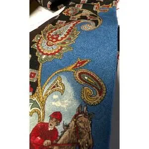 The Bill Robinson Equestrian Silk Necktie is a designer accessory made in the USA from 100% silk fabric, featuring a combination of patterns from paisley to an equestrian scene in a multicolor design is unique. This classic tie is perfect for men with a passion for equestrian themes and a love for high-quality, unique pieces. With its distinctive style and brand, this necktie is a standout piece that adds a touch of sophistication to any outfit. Really beautiful tie!