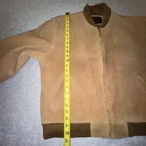 Vintage Reed Sportswear genuine suede leather bomber jacket. Tan suede with brown ribbing at waist, cuffs and collar. Two hand pockets and one interior pocket. Approximate measurements laying flat: the chest is 24 inches and the length is 25”. Size M