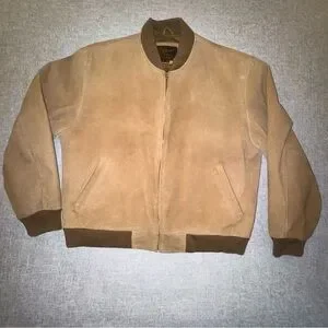 Reed Sportswear Vintage Tan Suede Leather Bomber Jacket Brown Ribbing Front Zip Closure Casual Motorcycle Everyday