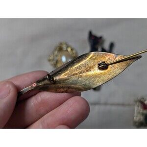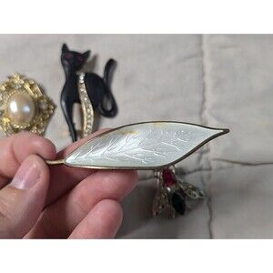 **Lot of 4 Vintage Pins (Cat, Bee/Fly, Leaf, Cabochon)** – Assorted vintage pin set featuring a black cat fly, bee/fly with multicolor stones, leaf, and cabochon design. Made from mixed metal and plastic; the leaf pin is by Norway Sterling. Used vintage condition with light general wear, one small mark on the leaf pin, and one missing gemstone on the bee/fly. Incidental scuffs may be present. A whimsical set for collectors or vintage jewelry lovers. Sold as-is—please review photos carefully. Ships in reused packaging with insurance. Smoke-free, pet-friendly home. Questions welcome!